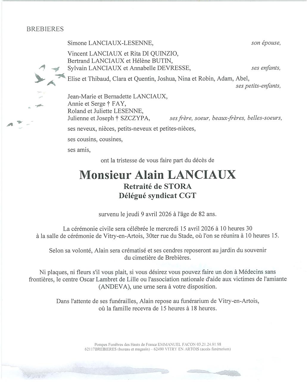 Funérarium Emmanuel Facon (Vitry) de Vitry-en-Artois le mercredi 15 avril à 10 heures 30