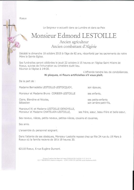 Décédé à Bapaume (62450, France) le dimanche 18 octobre 2015 à l'âge de 82 ans