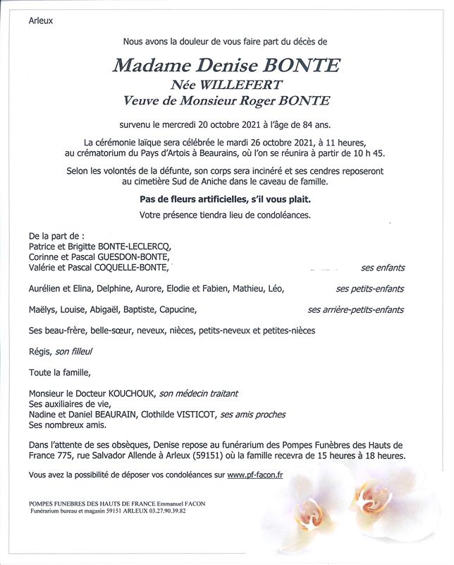 Décédée à Dechy (59187, France) le mercredi 20 octobre 2021 à l'âge de 84 ans