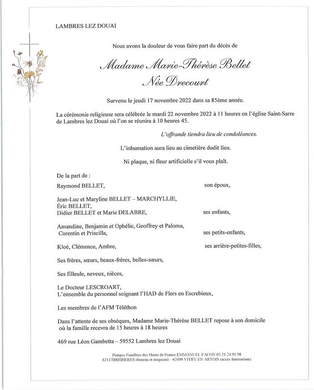 Décédée à Lambres-lez-Douai (59552, France) le jeudi 17 novembre 2022 à l'âge de 84 ans