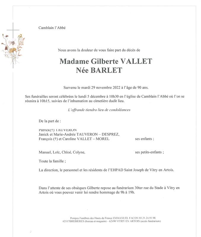 Madame Gilberte VALLET née BARLET