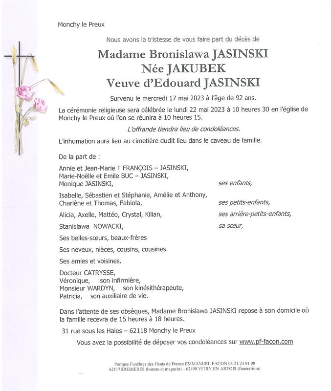 Décédée à Monchy-le-Preux (62118, France) le mercredi 17 mai 2023 à l'âge de 92 ans