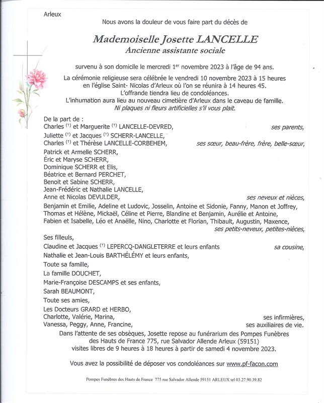 Décédée à Arleux (59151, France) le mercredi 1 novembre 2023 à l'âge de 94 ans
