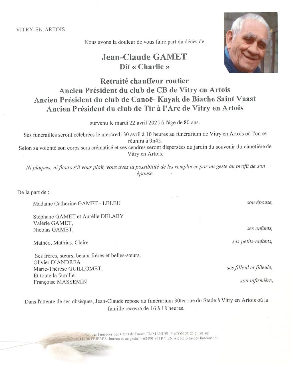 Décédé à Vitry-en-Artois (62490, France) le mardi 22 avril 2025 à l'âge de 80 ans