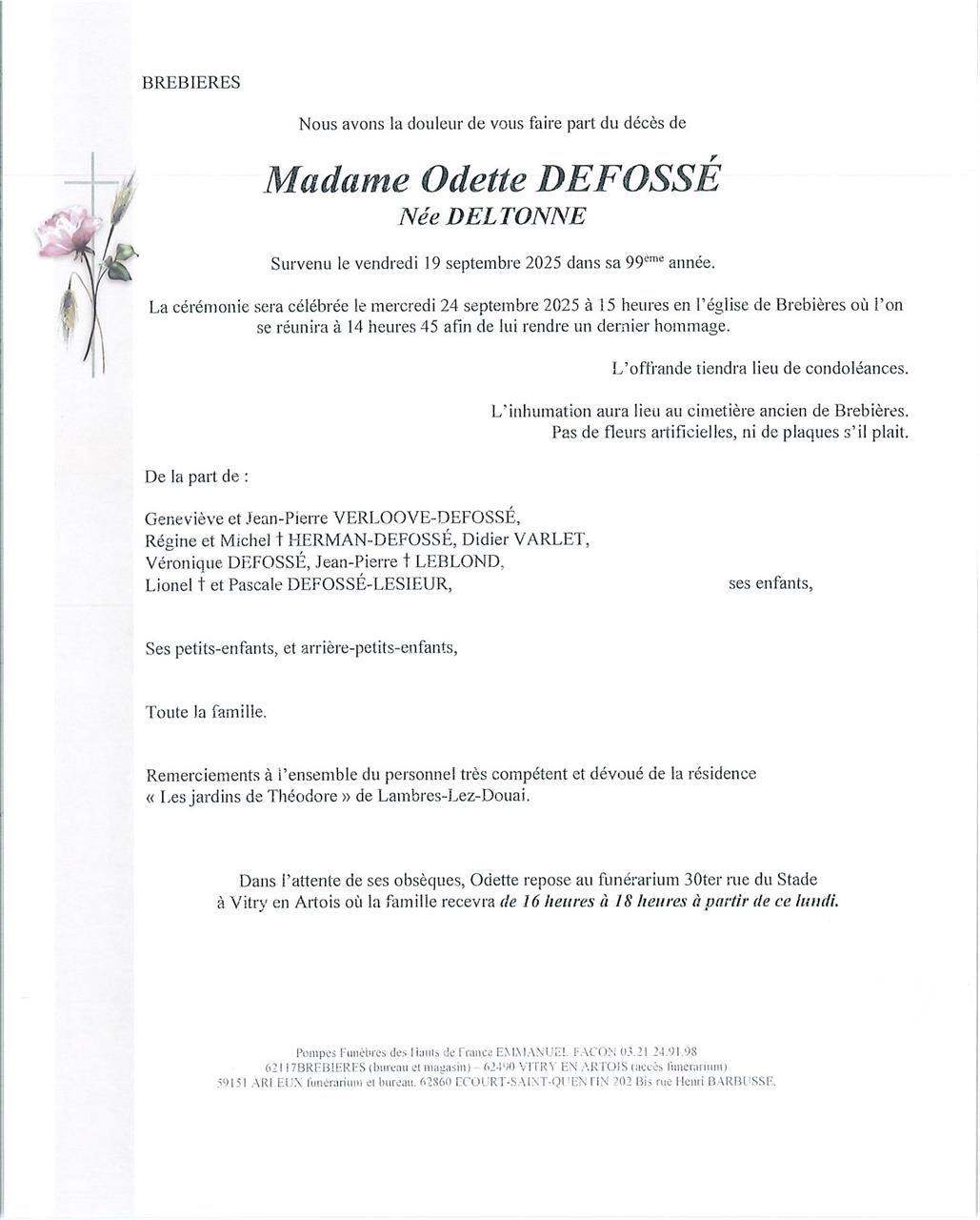 Décédée à Lambres-lez-Douai (59552, France) le vendredi 19 septembre 2025 à l'âge de 98 ans
