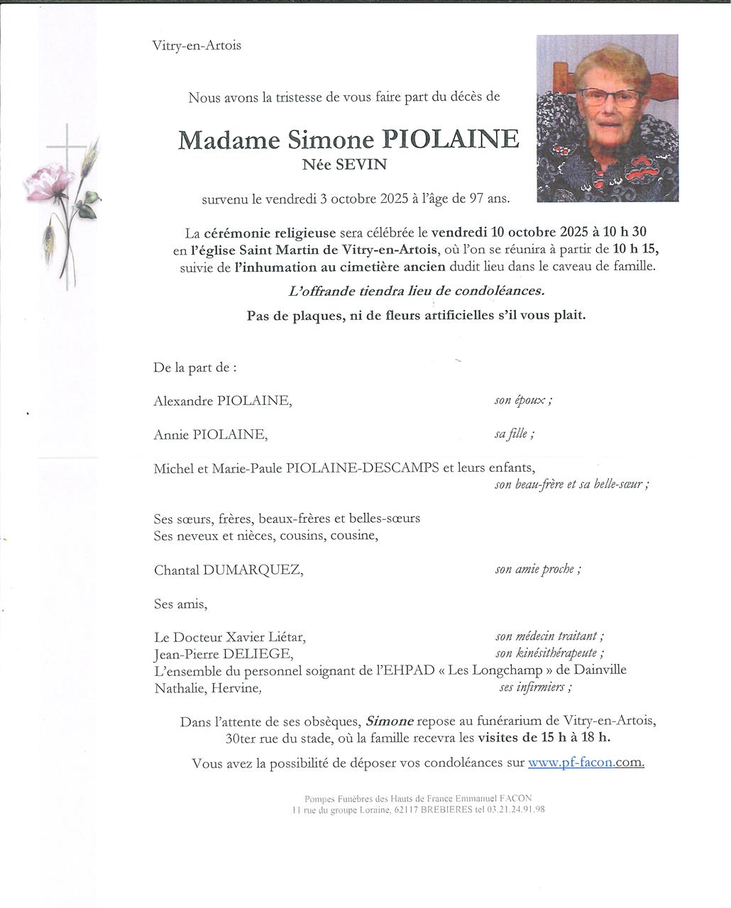 Décédée à Dainville (62000, France) le vendredi 3 octobre 2025 à l'âge de 97 ans