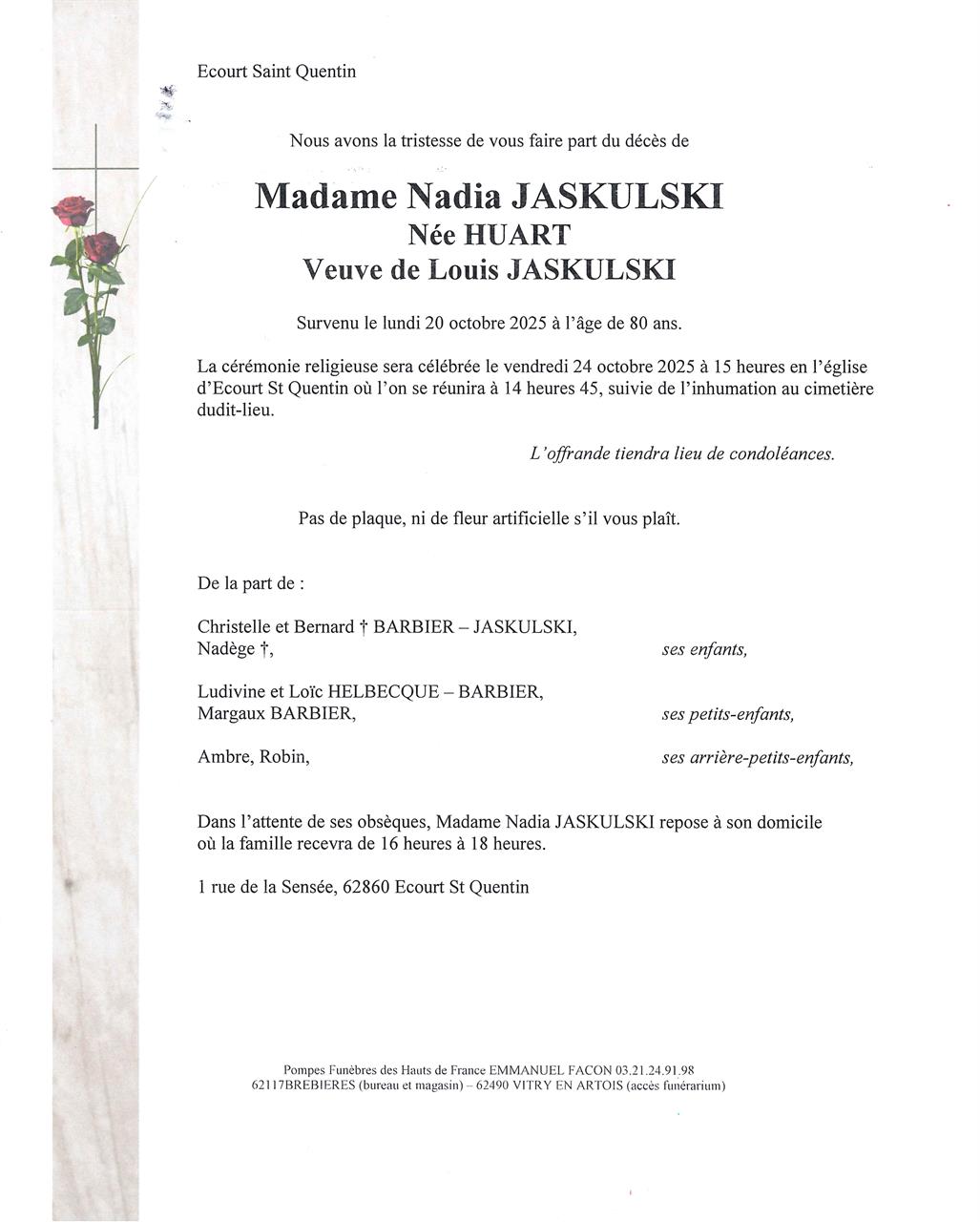 Décédée à Arras (62000, France) le lundi 20 octobre 2025 à l'âge de 80 ans