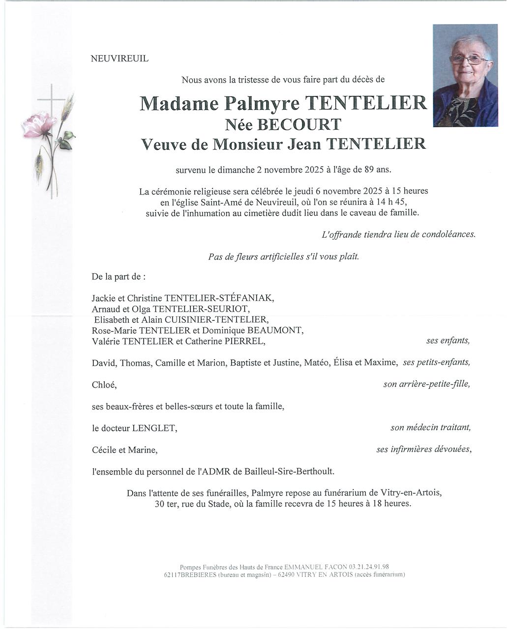 Veuve de Monsieur Jean, Joseph TENTELIER