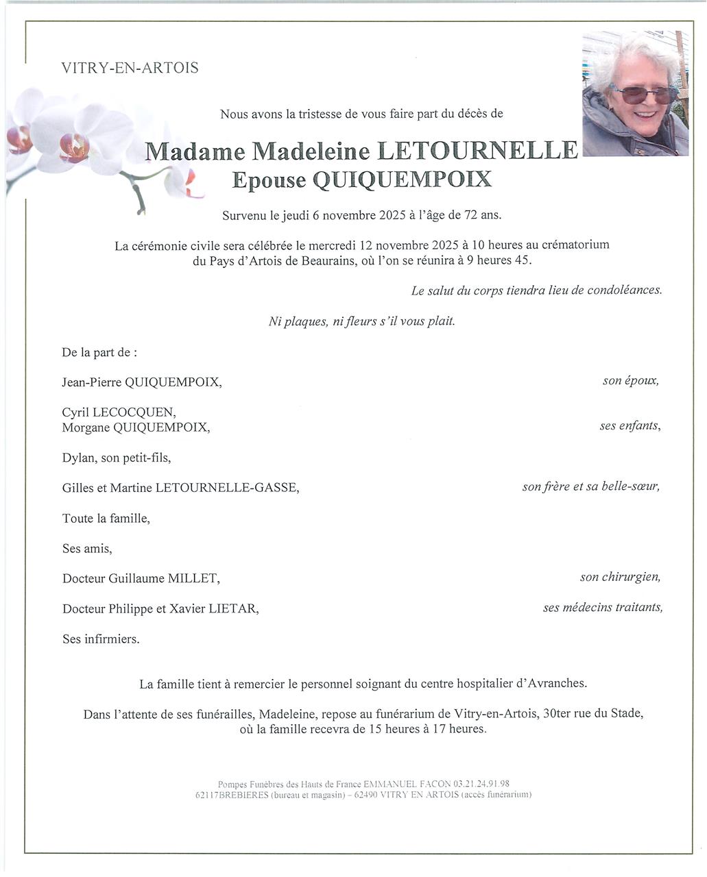 Madame Madeleine QUIQUEMPOIX née LETOURNELLE