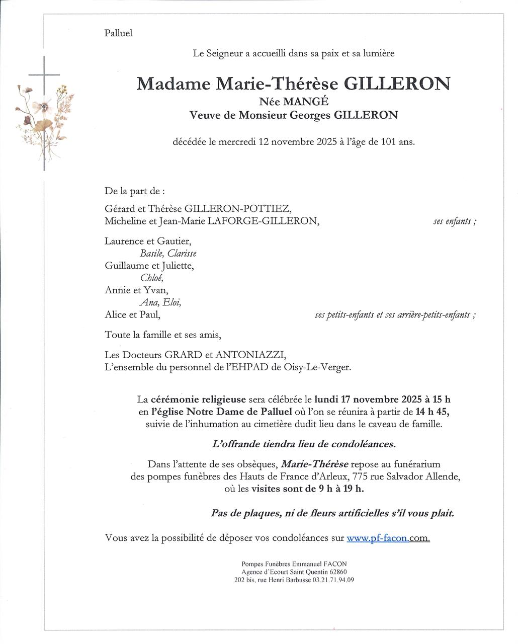 Madame Marie-Thérèse GILLERON née MANGÉ