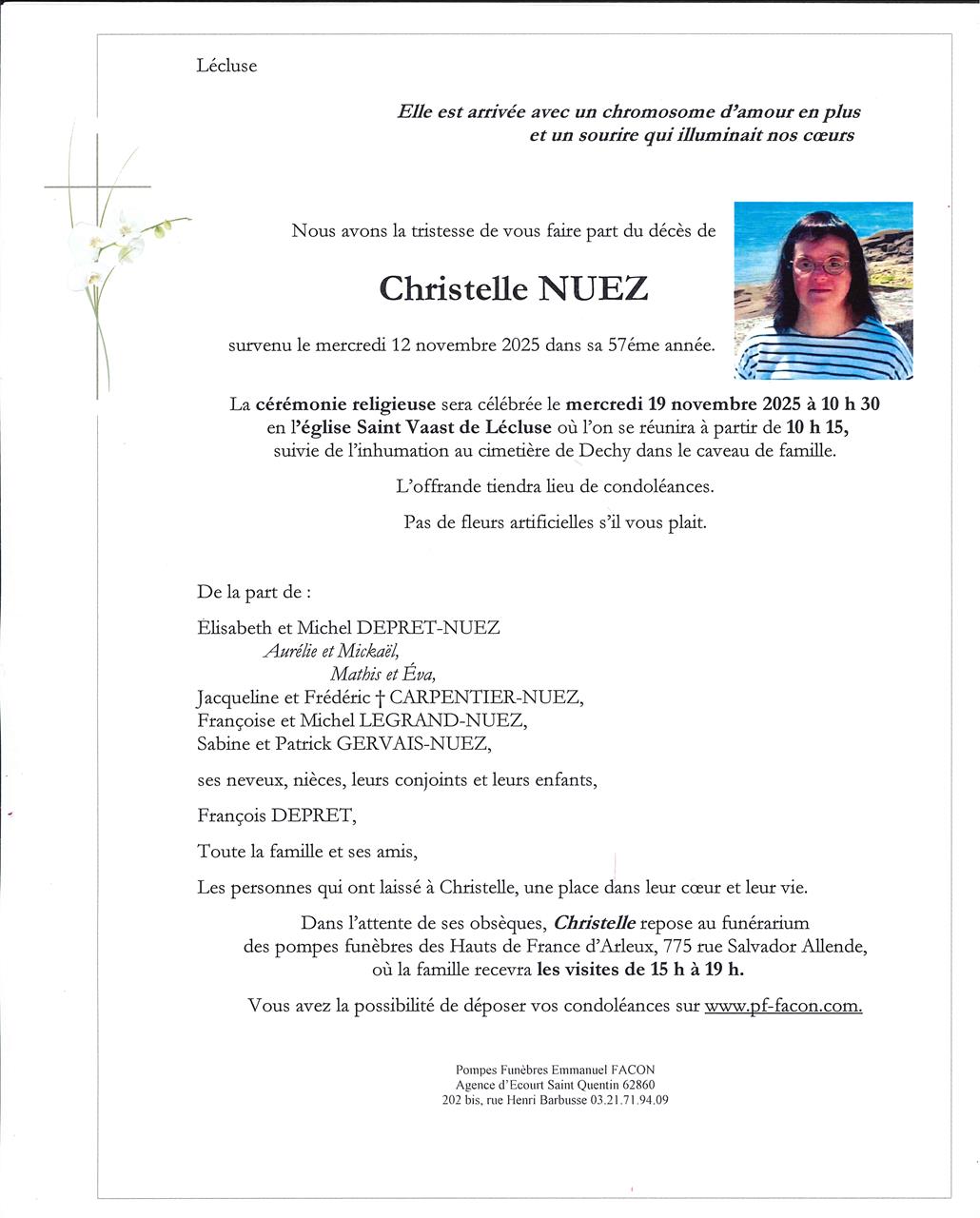 Décédée à Lecluse (59259, France) le mercredi 12 novembre 2025 à l'âge de 57 ans