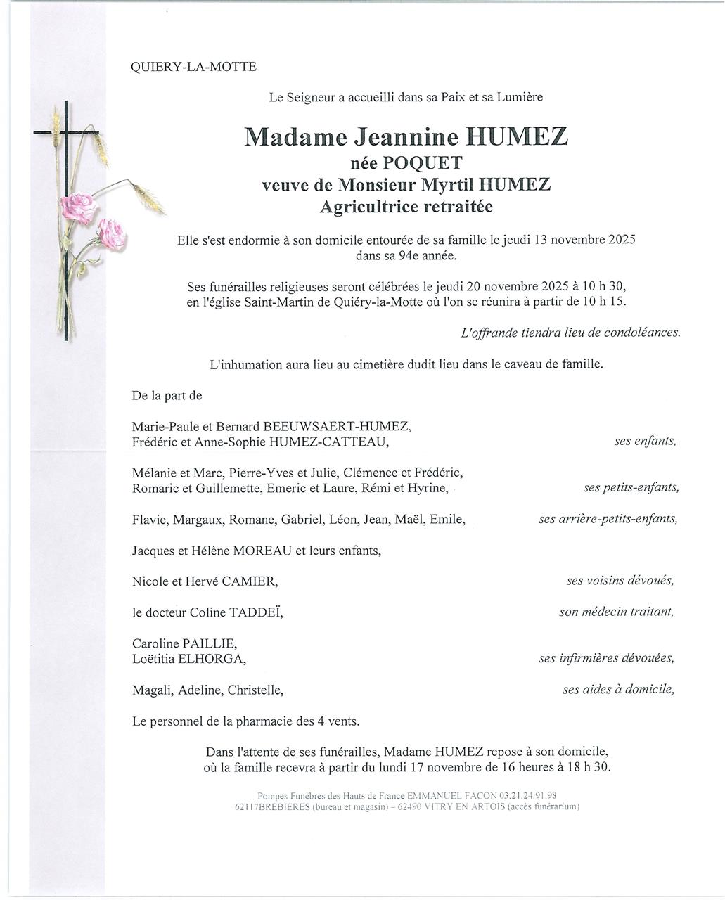 Décédée à Quiéry-la-Motte (62490, France) le jeudi 13 novembre 2025 à l'âge de 93 ans