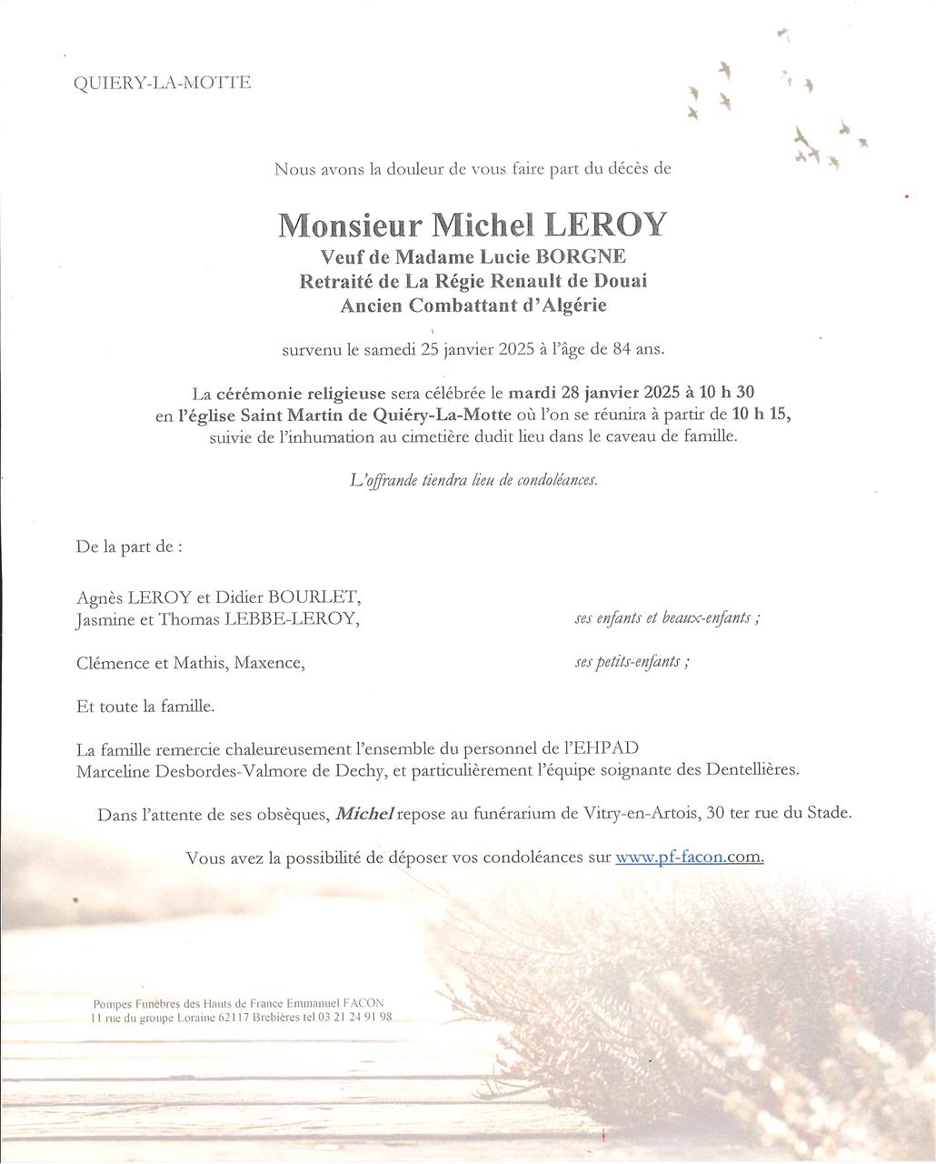 Décédé à Dechy (59187, France) le samedi 25 janvier 2025 à l'âge de 84 ans