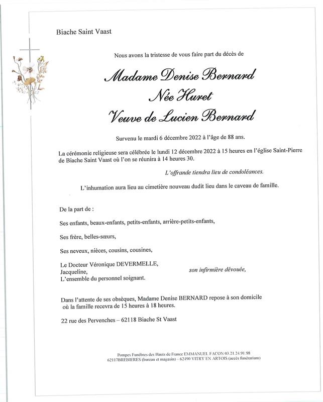 Décédée à Biache-Saint-Vaast (62118, France) le mardi 6 décembre 2022 à l'âge de 88 ans
