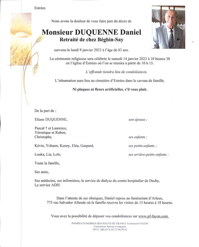 Décédé à Estrées (59151, France) le lundi 9 janvier 2023 à l'âge de 83 ans