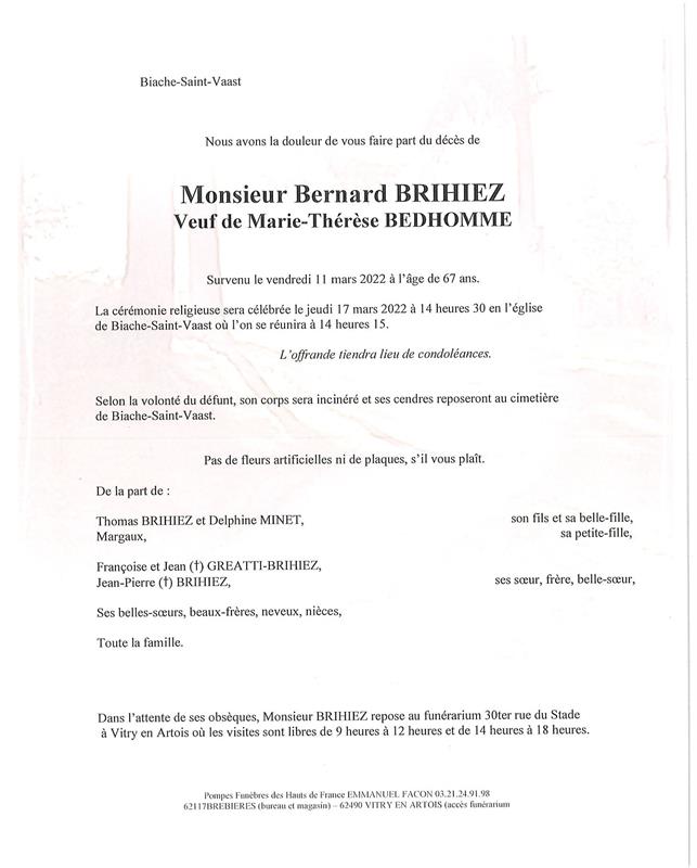 Décédé à Boisjean (62170, France) le vendredi 11 mars 2022 à l'âge de 67 ans
