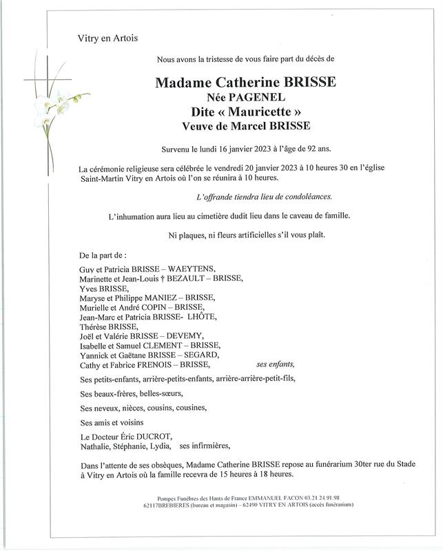 Décédée à Arras (62000, France) le lundi 16 janvier 2023 à l'âge de 92 ans