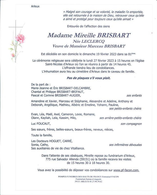 Décédée à Arleux (59151, France) le dimanche 19 février 2023 à l'âge de 80 ans