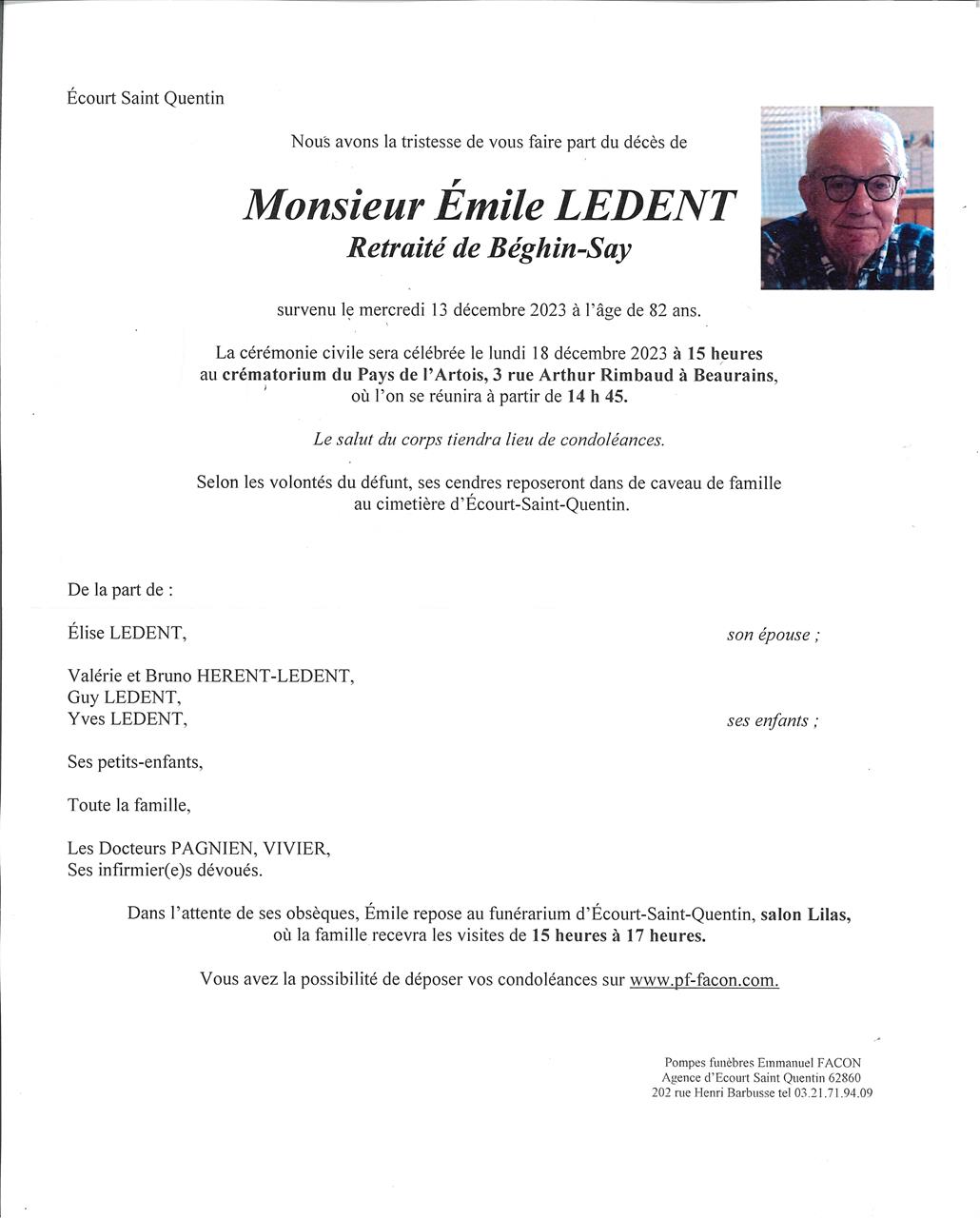 Décédé à Écourt-Saint-Quentin (62860, France) le mercredi 13 décembre 2023 à l'âge de 82 ans