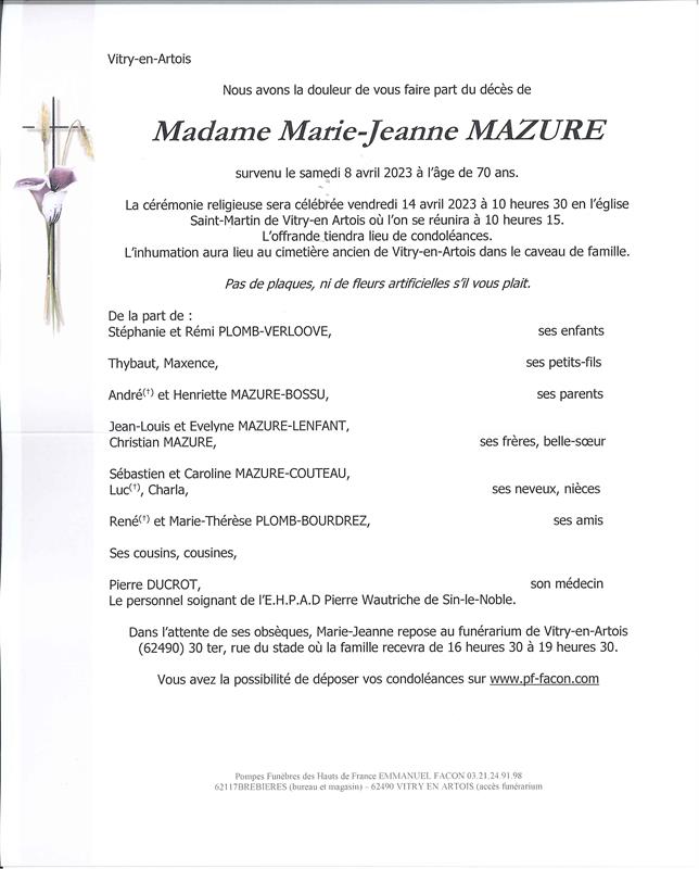 Décédée à Sin-le-Noble (59450, France) le samedi 8 avril 2023 à l'âge de 70 ans
