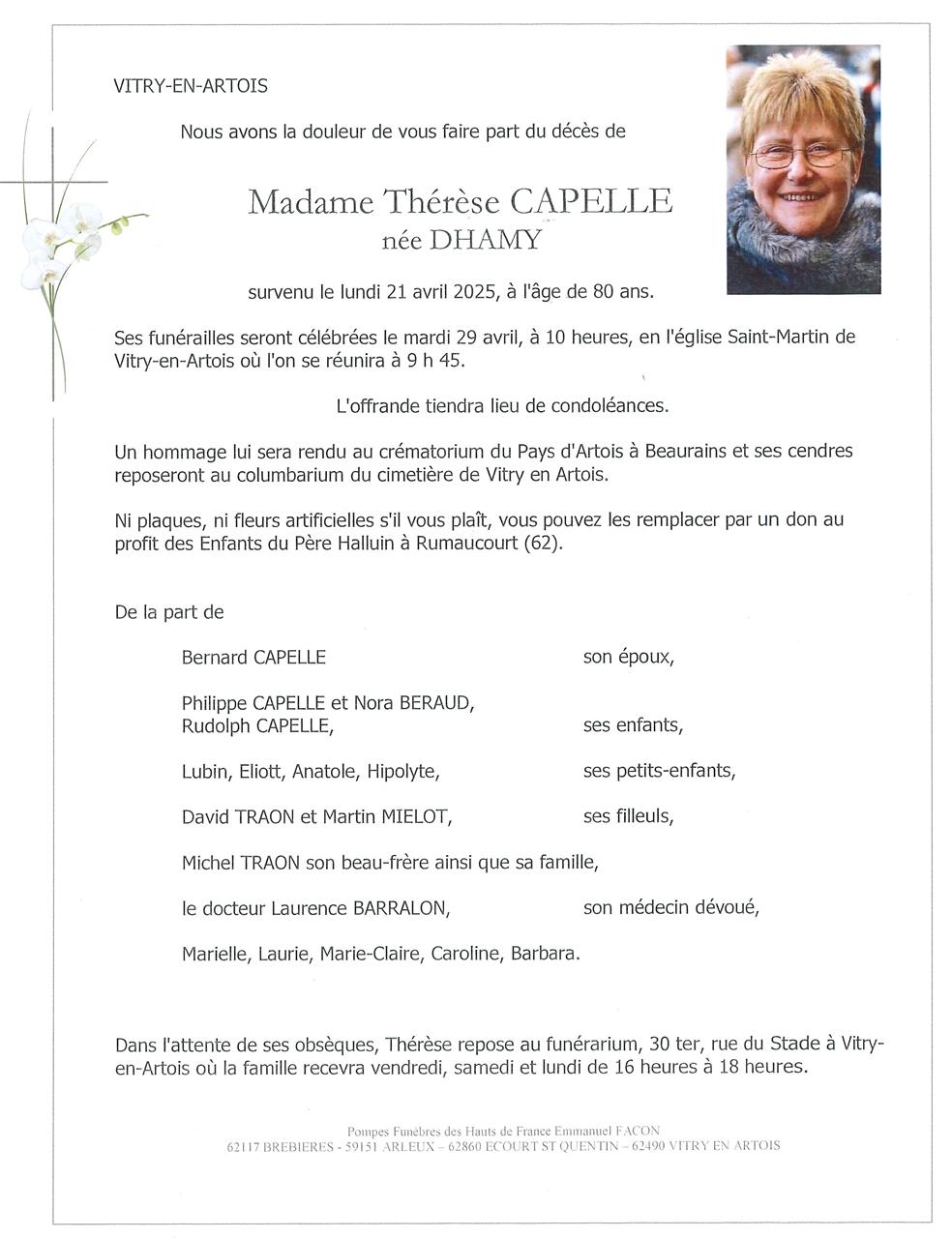 Décédée à Arras (62000, France) le lundi 21 avril 2025 à l'âge de 80 ans