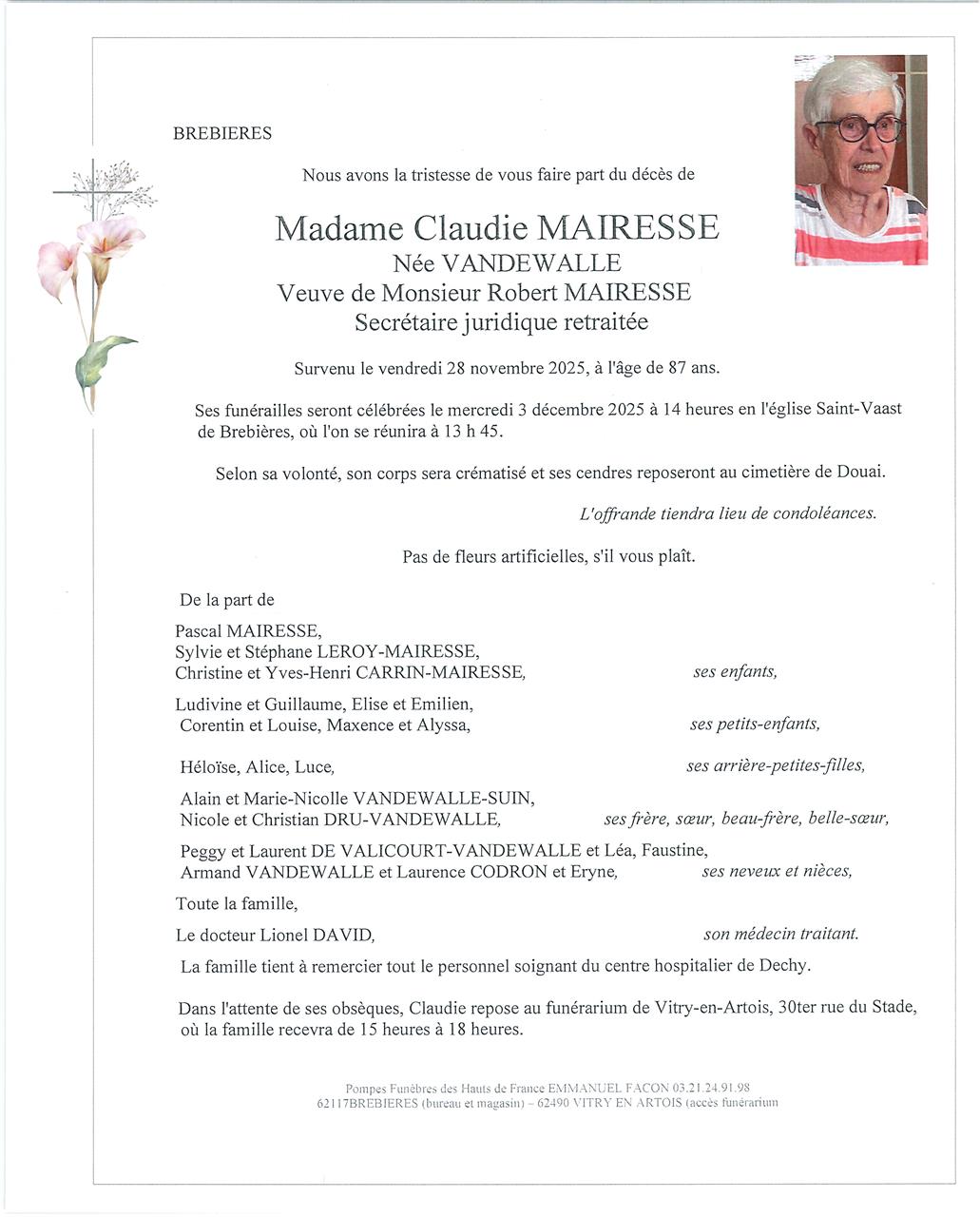 Décédée à Dechy (59187, France) le vendredi 28 novembre 2025 à l'âge de 87 ans