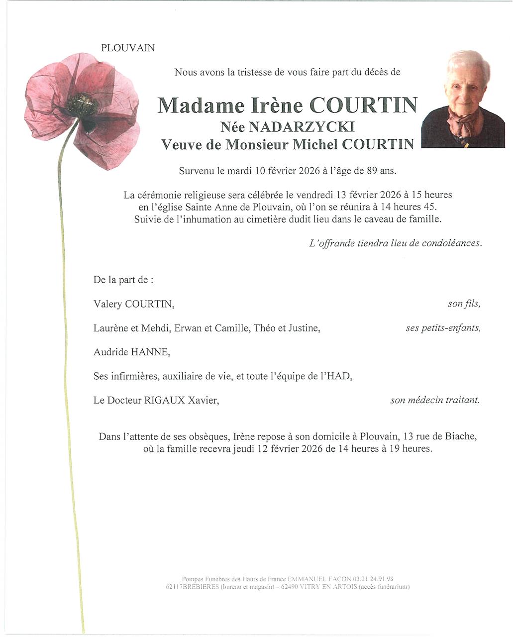Décédée à Plouvain (62118, France) le mardi 10 février 2026 à l'âge de 89 ans
