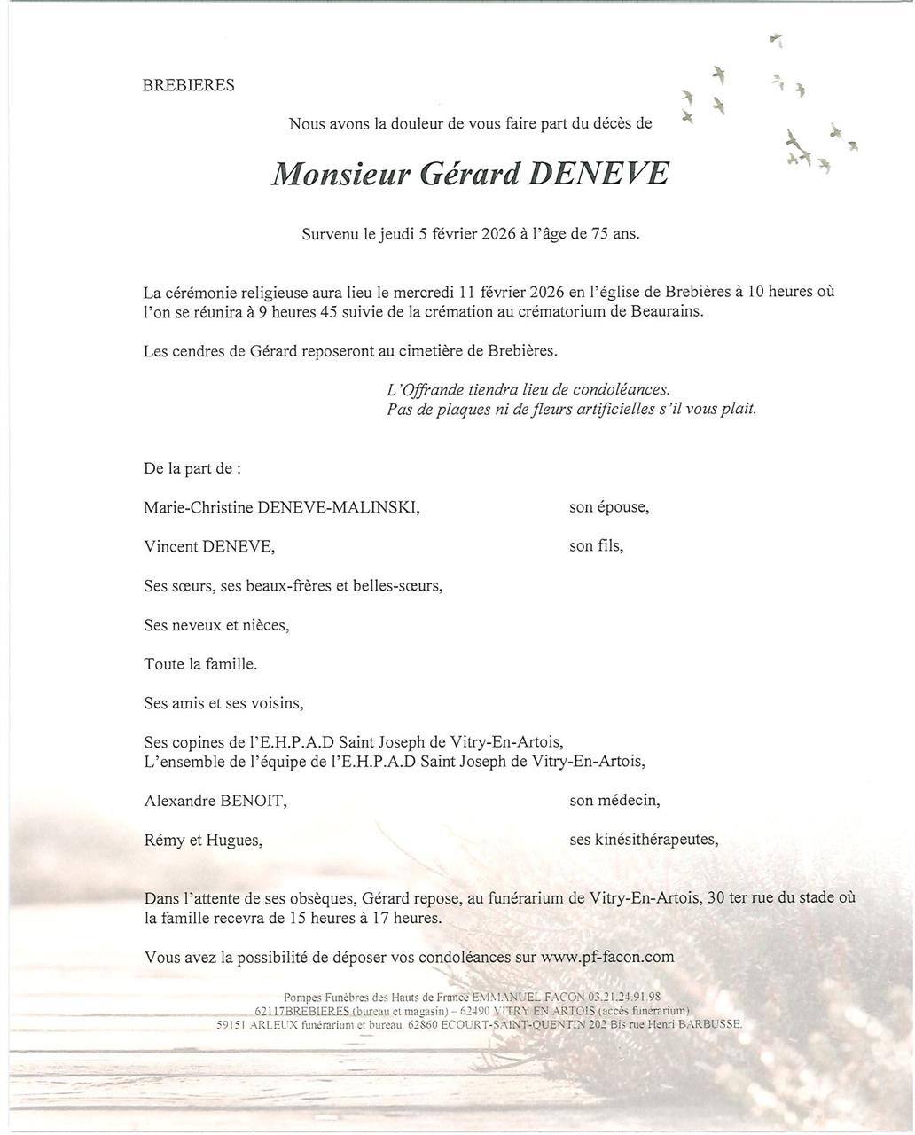 Décédé à Vitry-en-Artois (62490, France) le jeudi 5 février 2026 à l'âge de 75 ans