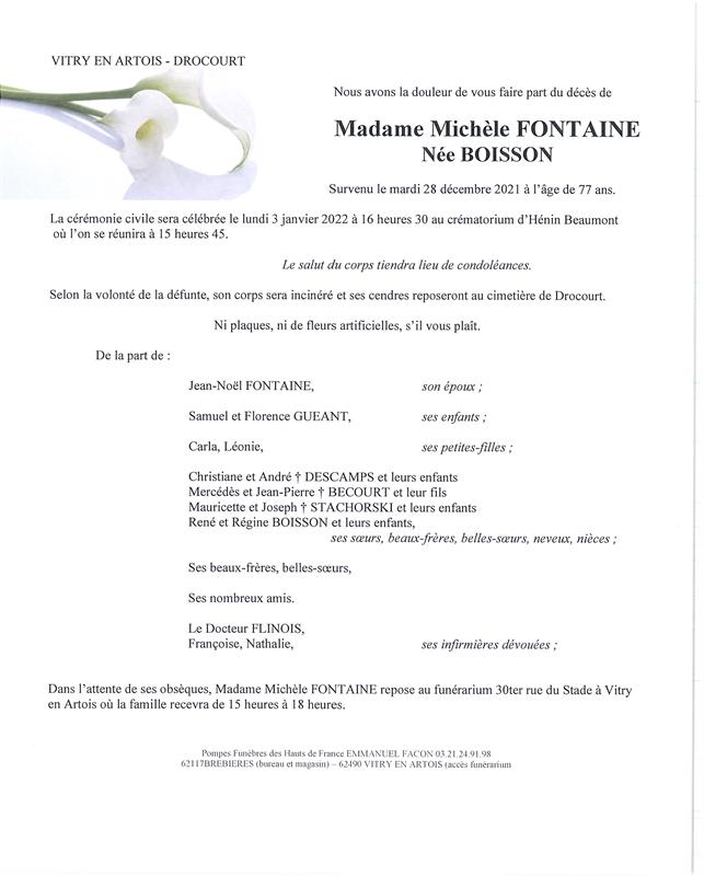 Décédée à Drocourt (62320, France) le mardi 28 décembre 2021 à l'âge de 77 ans