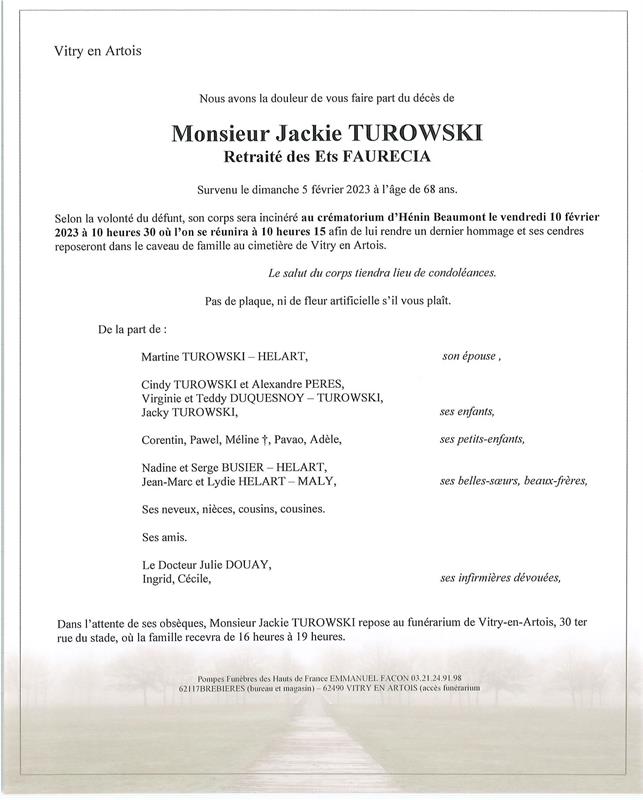Décédé à Arras (62000, France) le dimanche 5 février 2023 à l'âge de 68 ans