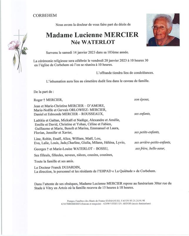 Madame LUCIENNE MERCIER née WATERLOT