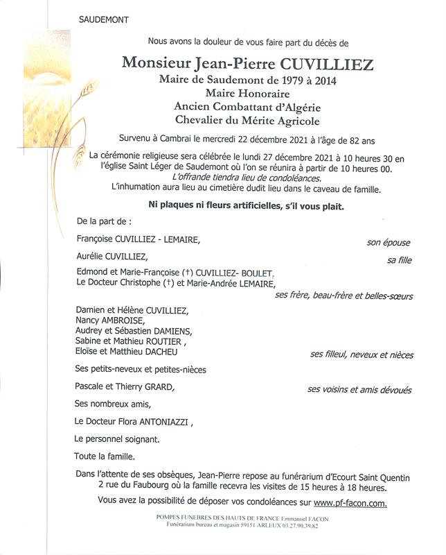 Décédé à Cambrai (59400, France) le mercredi 22 décembre 2021 à l'âge de 82 ans