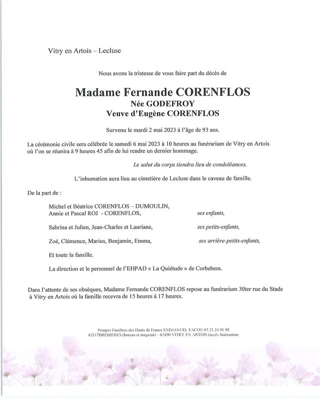 Décédée à Corbehem (62112, France) le mardi 2 mai 2023 à l'âge de 93 ans