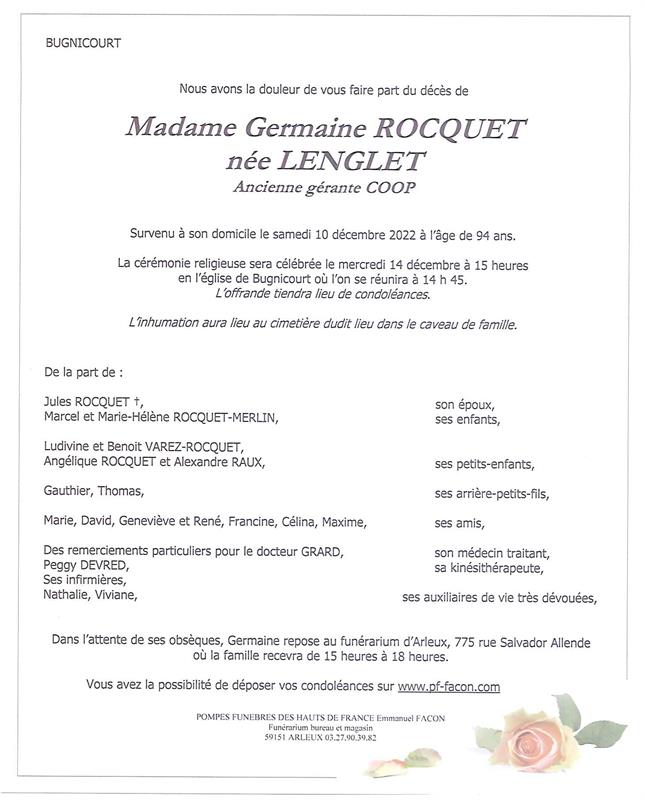 Décédée à Bugnicourt (59151, France) le samedi 10 décembre 2022 à l'âge de 94 ans