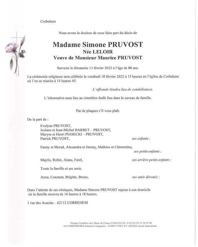 Décédée à Arras (62000, France) le dimanche 13 février 2022 à l'âge de 88 ans