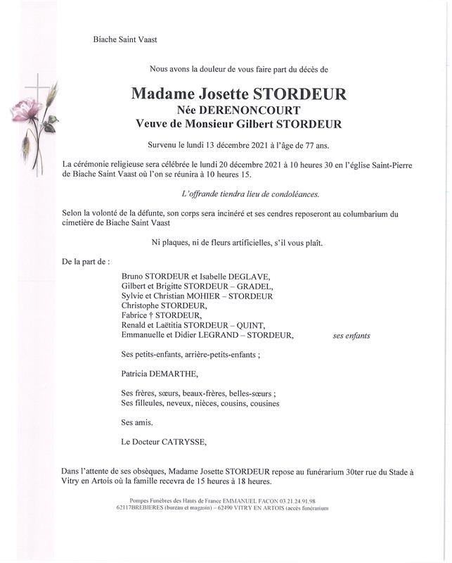 Madame Josette STORDEUR née DERENONCOURT