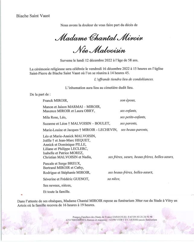 Décédée à Biache-Saint-Vaast (62118, France) le lundi 12 décembre 2022 à l'âge de 58 ans