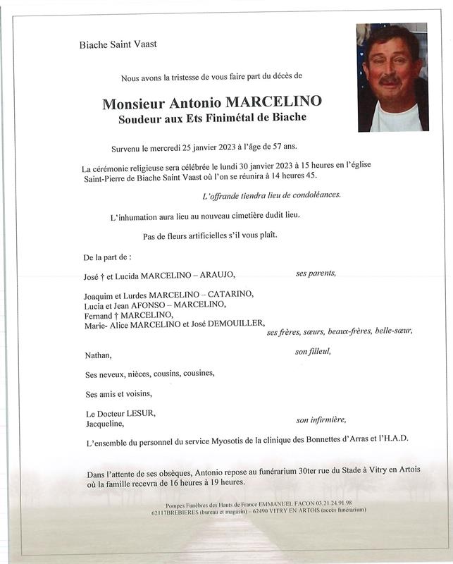 Décédé à Biache-Saint-Vaast (62118, France) le mercredi 25 janvier 2023 à l'âge de 57 ans