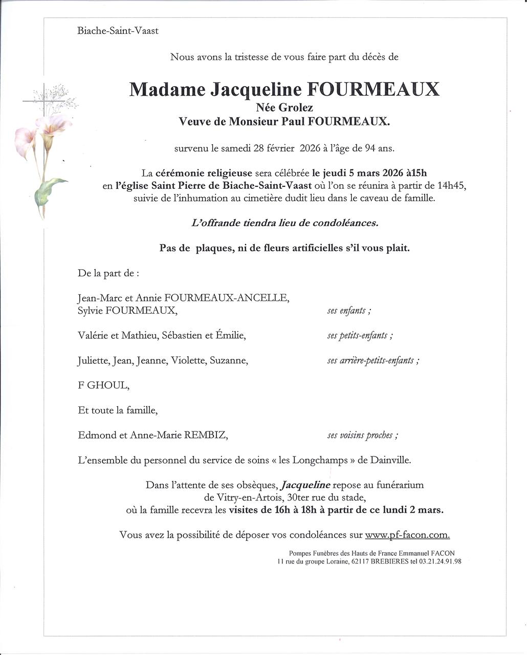 Madame Jacqueline FOURMEAUX née GROLEZ