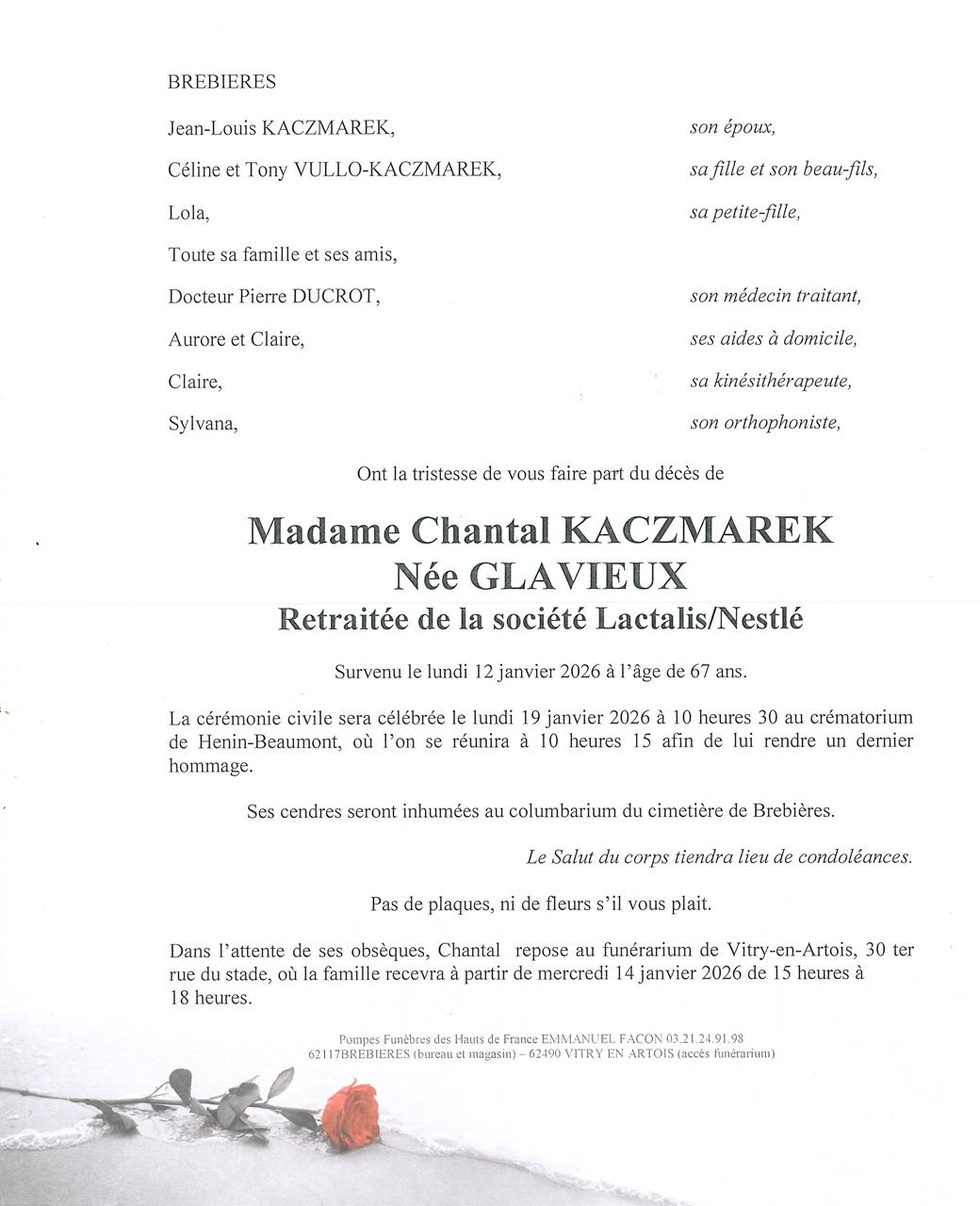 Décédée à Brebières (62117, France) le lundi 12 janvier 2026 à l'âge de 67 ans