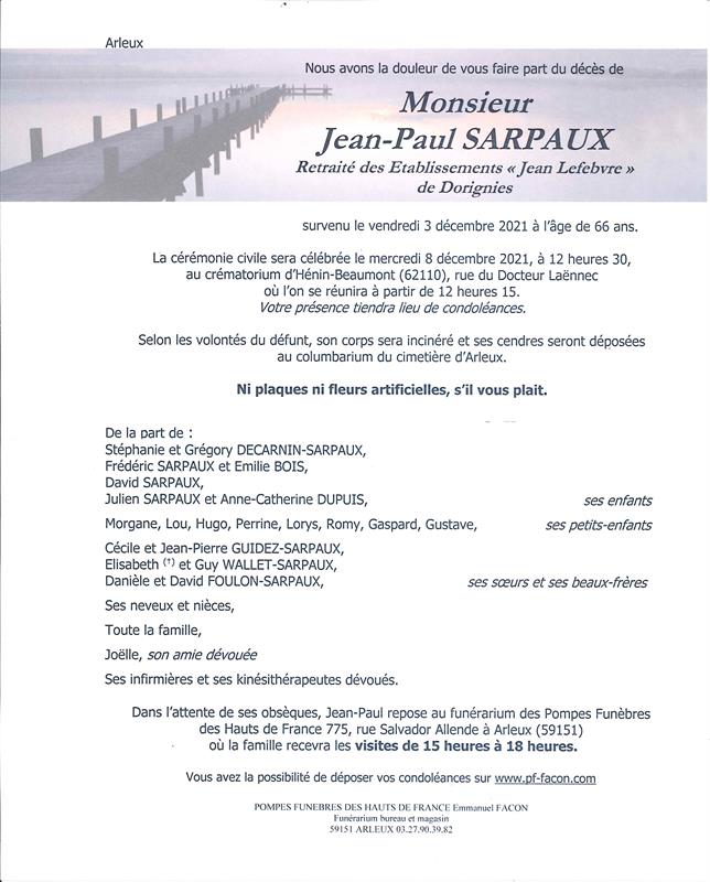 Décédé à Arleux (59151, France) le vendredi 3 décembre 2021 à l'âge de 66 ans