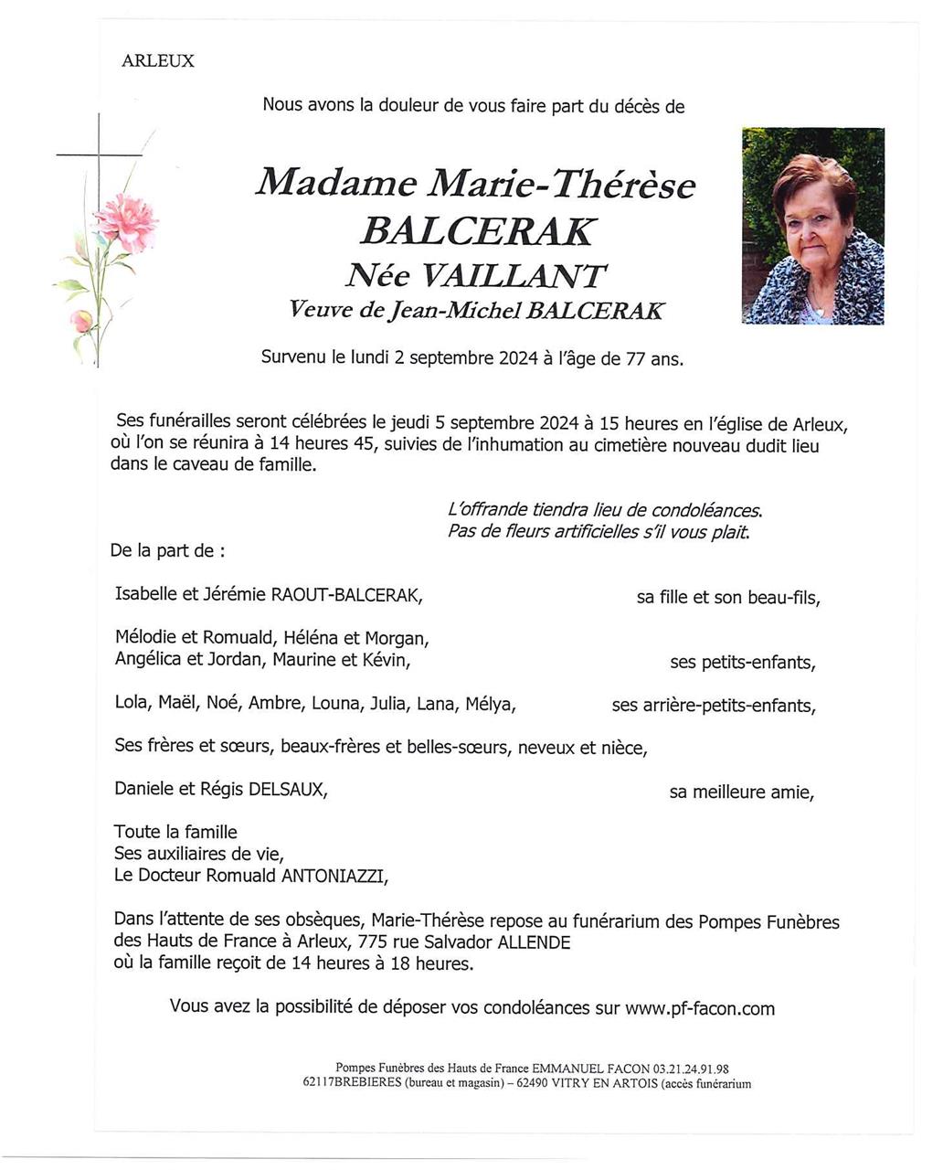 Madame Marie-Thérèse BALCERAK née VAILLANT
