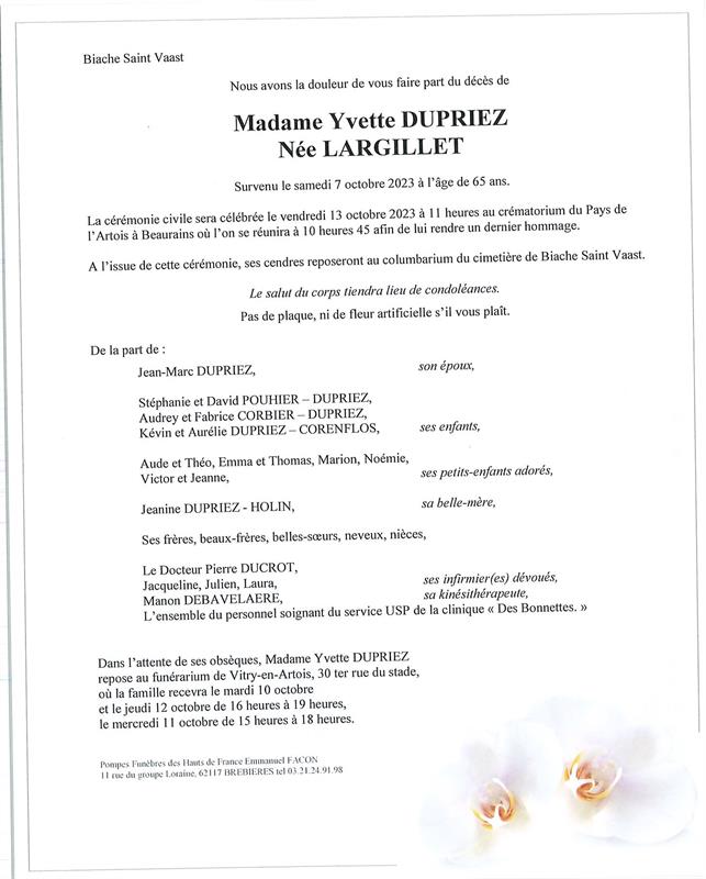 Madame Yvette DUPRIEZ née LARGILLET