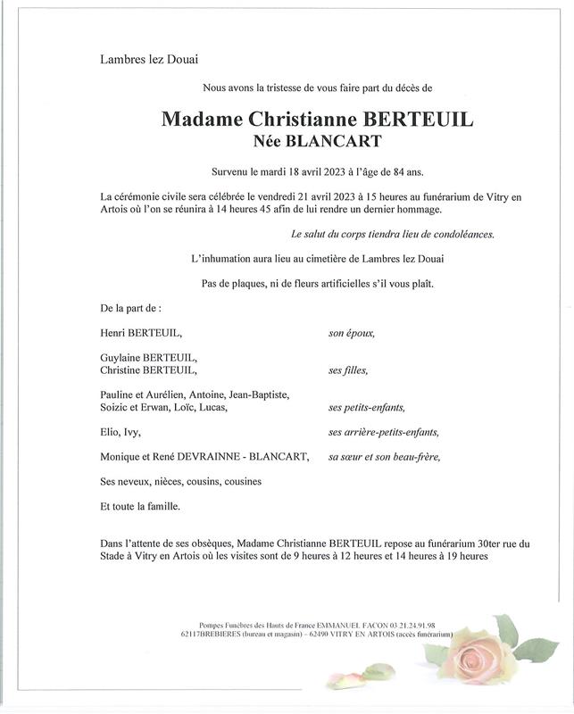 Décédée à Lambres-lez-Douai (59552, France) le mardi 18 avril 2023 à l'âge de 84 ans