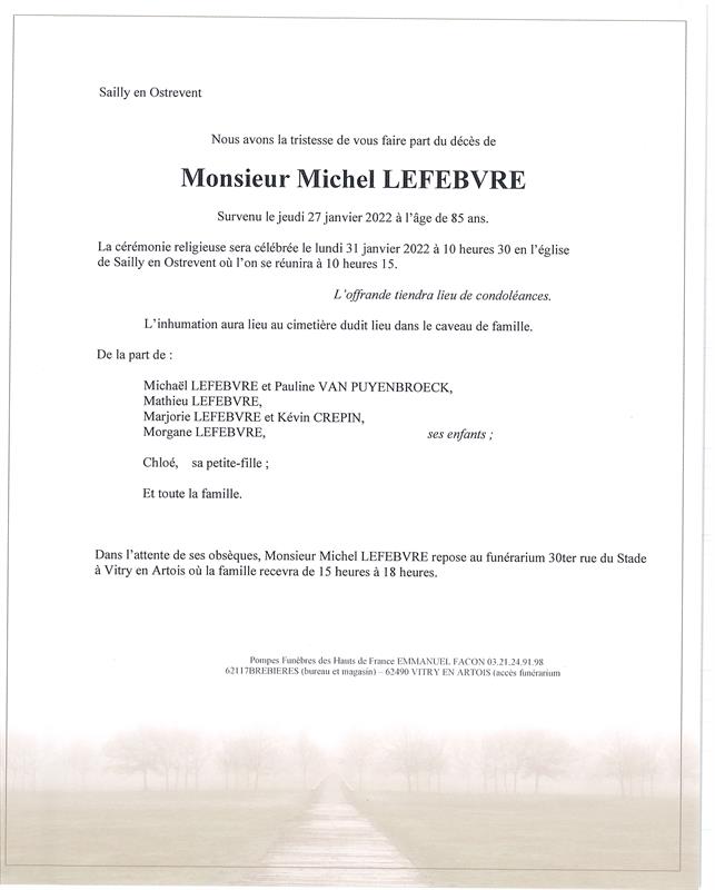 Décédé à Cambrai (59400, France) le jeudi 27 janvier 2022 à l'âge de 85 ans