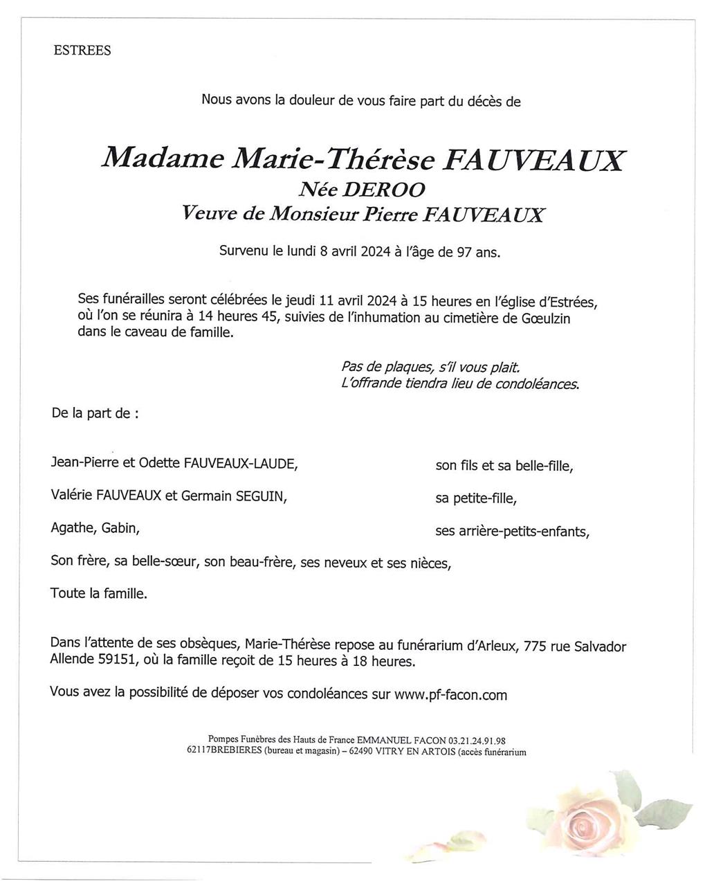 Madame Marie-Thérèse Germaine Julia FAUVEAUX née DEROO