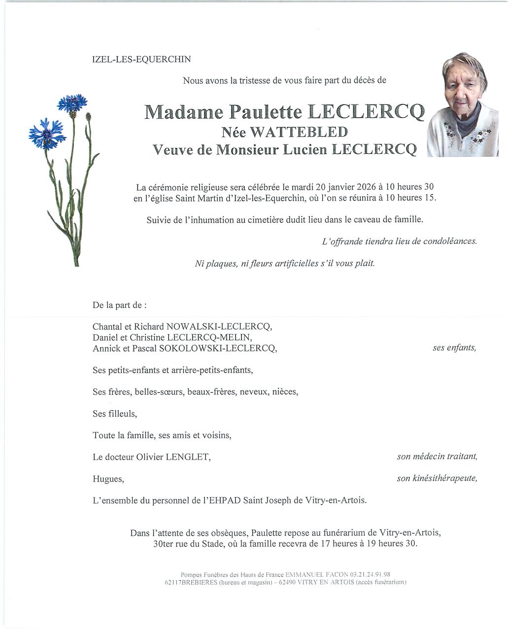 Veuve de Monsieur Lucien, Oscar, Joseph LECLERCQ