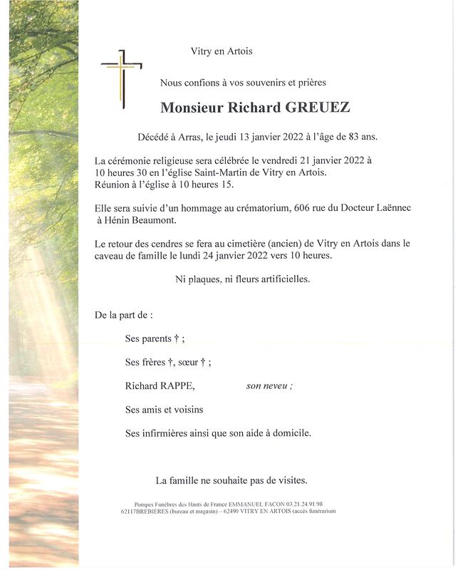 Décédé à Arras (62000, France) le vendredi 14 janvier 2022 à l'âge de 83 ans