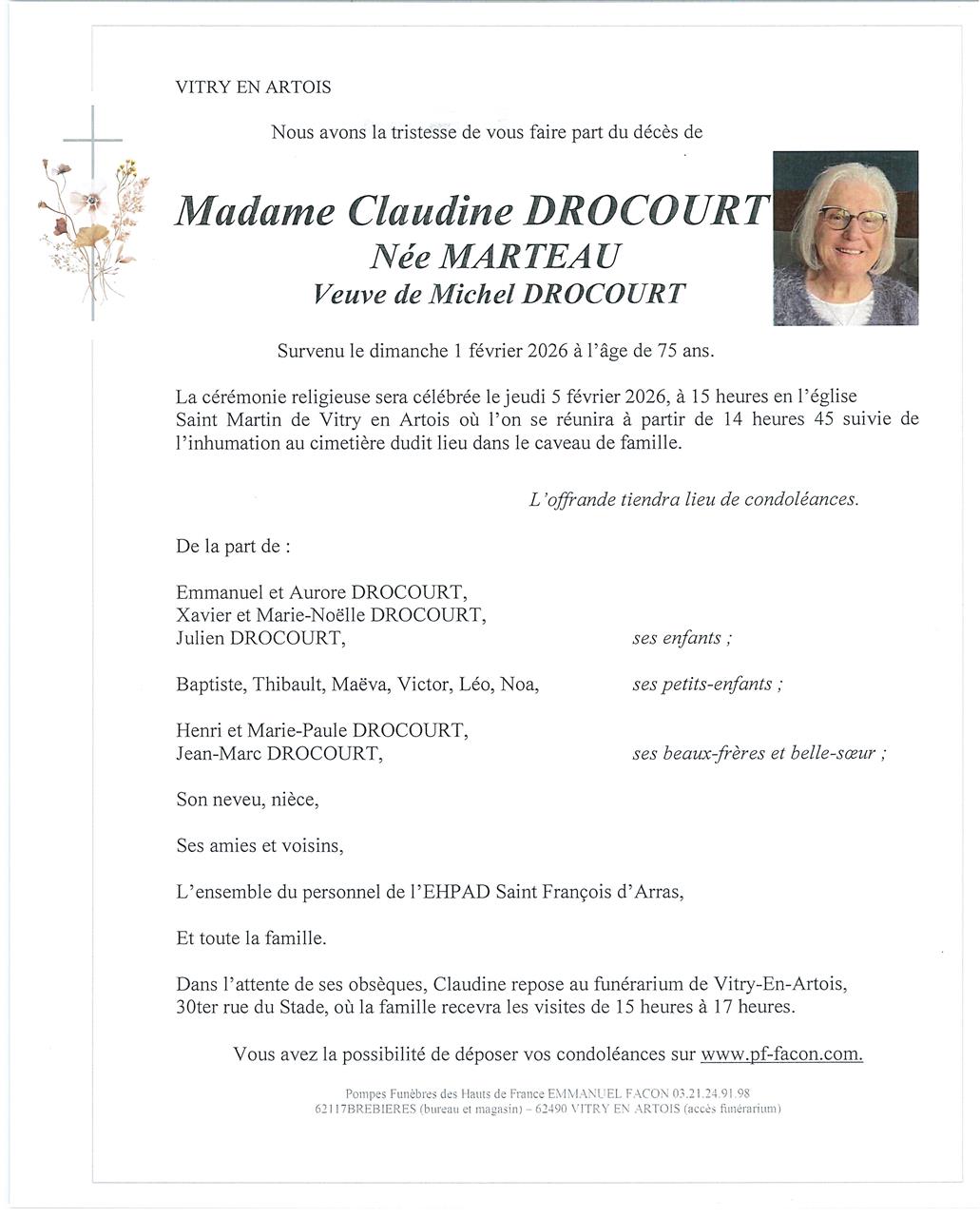 Décédée à Lambres-lez-Douai (59552, France) le dimanche 1 février 2026 à l'âge de 75 ans