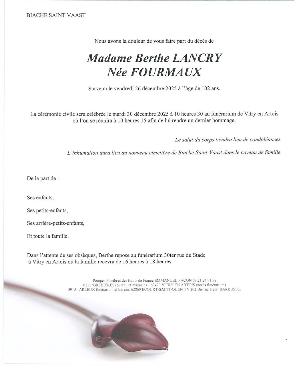 Décédée à Vitry-en-Artois (62490, France) le vendredi 26 décembre 2025 à l'âge de 102 ans